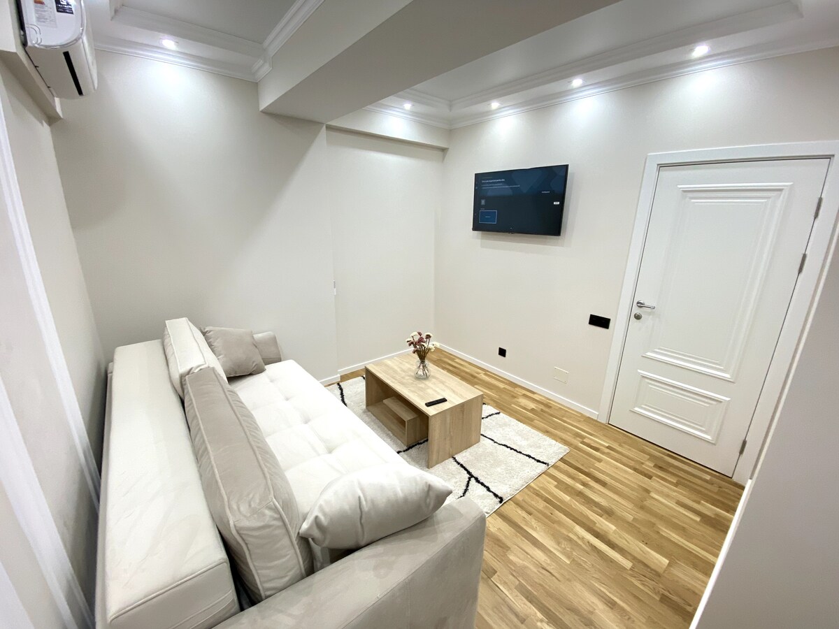 Benvenuto nel tuo elegante rifugio urbano a Chișinău! Situato nel lussuoso Oasis Residence (Râșcani), questo appartamento di 55 m² offre una vista sull'alba da un balcone privato, un lussuoso letto king-size, un divano estensibile, una Smart TV con Netflix e Wi-Fi ad alta velocità. La cucina completamente attrezzata include una macchina per caffè espresso Lavazza, una lavastoviglie e altro ancora. Goditi il tranquillo cortile recintato, la spa e la palestra in loco (a pagamento) e l'accesso diretto a Kaufland e a un centro commerciale. Comfort, eleganza e praticità per te