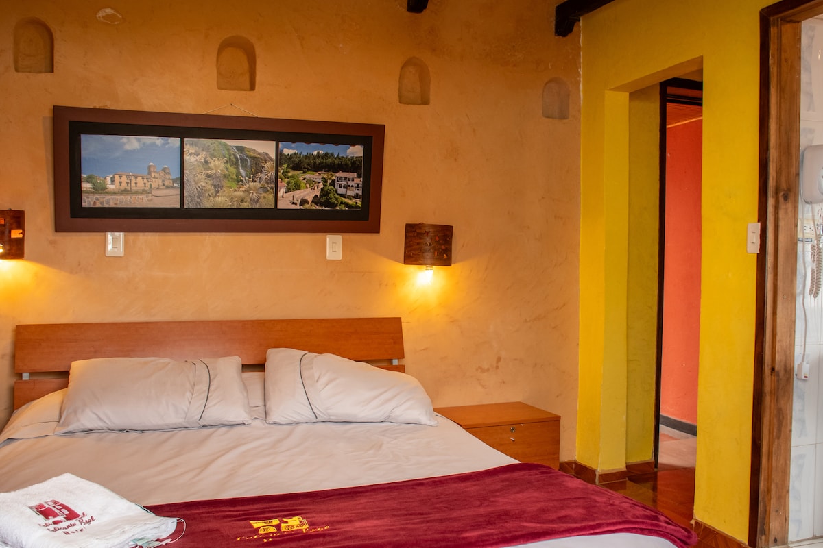 Goditi la nostra accogliente Junior Suite con letto matrimoniale, divano letto, sala da pranzo, macchina per il caffè, TV e bagno privato. Perfetto per il riposo e il relax. Ha una splendida vista sulla strada principale di Monguí. Ideale per coppie o famiglie che cercano comfort e stile in un'atmosfera tranquilla e affascinante.