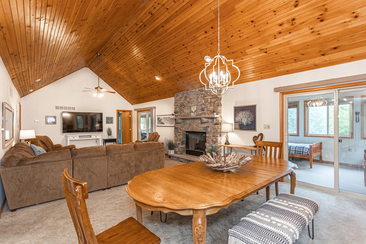 Goditi la nostra oasi all'aperto, immersa nelle montagne Pocono! Il nostro chalet con 3 camere da letto recentemente ristrutturato dispone di un ulteriore spazio abitativo all'aperto di 93 metri quadrati, arredato con 2 aree salotto separate, un gazebo coperto e una vasca idromassaggio. Goditi i pasti all'aperto mentre osservi i cervi saltellare nel cortile sul retro. Oppure rimani al chiuso e accomodati sul divano per guardare film sulla nostra smart TV da 72 pollici. L'alloggio si trova a Towamensing Trails, che offre servizi extra come piscina, lago e parco giochi.