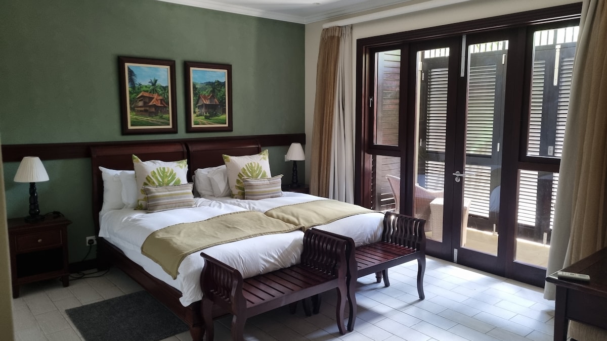 Un appartamento di lusso al piano terra in posizione centrale sull'Eden Island, vicino a tutti i servizi. Siamo elencati negli alloggi autorizzati. Completamente accessoriata con due camere da letto, entrambe con doccia privata e WC separato. Aria condizionata dappertutto e giardino privato. Auto da golf privata inclusa Accesso a 4 spiagge, palestra, campo da tennis e piscine. (Vicino all'appartamento) Una vicina piazza dello shopping include: ambulatorio medico, chemista, bar, ristoranti, attività sportive marine sono disponibili