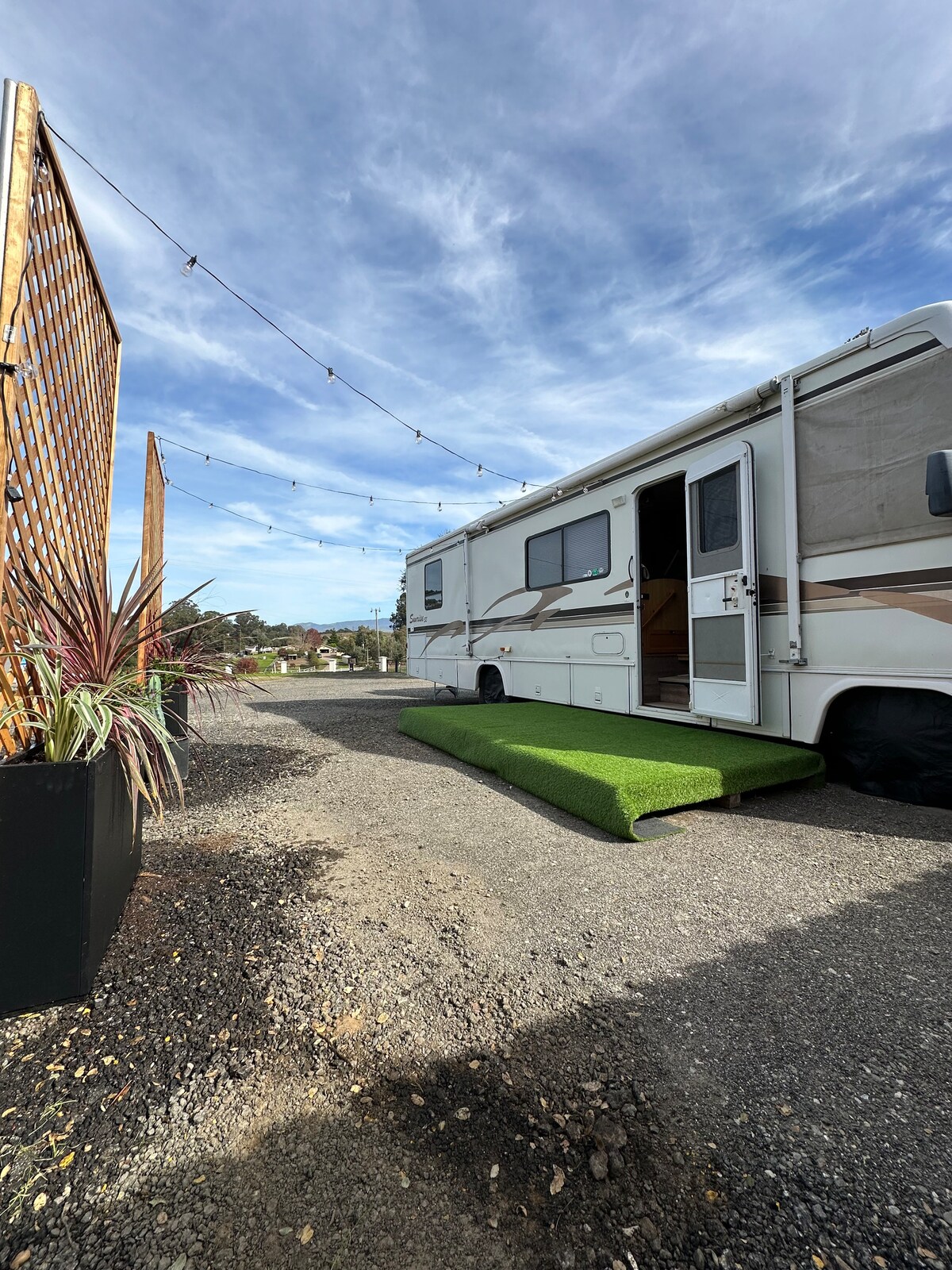 Goditi il tuo soggiorno in un camper di 43 piedi con 2 camere da letto, bagno, cucina, sala da pranzo e soggiorno. Il camper si trova al centro di un ranch di 63 acri con una splendida vista sulle colline dorate della California. Sei a 10 minuti dal centro di Salinas e a 35 minuti dalla splendida zona di Carmel By The Sea/Monterey/Pebble Beach. Siete abbastanza vicini a tutti gli eventi ma a una distanza di distanza per godere della quiete della vita ranch. Il tuo gentile host vive nella casa padronale del ranch.