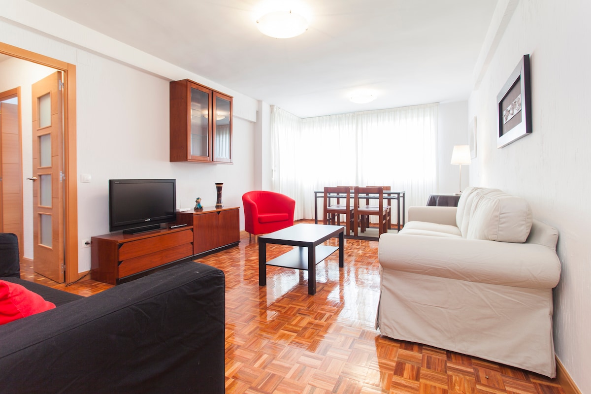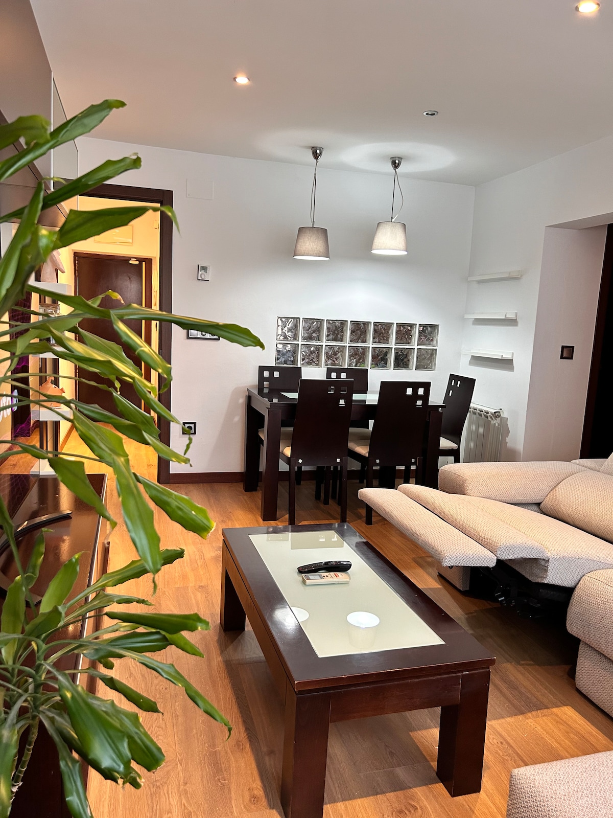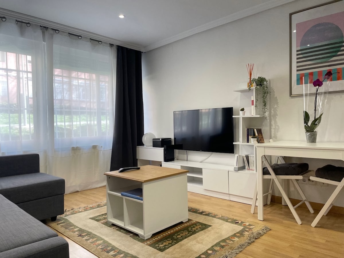 Appartamento al livello della strada. Ideale per viaggi di lavoro, viaggi di studio, questioni mediche, ecc. con piano cottura in vetroceramica, frigorifero, lavatrice/asciugatrice, lavastoviglie, pompa aria calda/fredda, forno a microonde, Nespresso, utensili da cucina completi, bollitore per infusi, letto matrimoniale, divano letto 190x150, smart TV, Wi-Fi, sveglia, linea metropolitana diretta per Sol (15"), ampio bagno, doccia a pioggia, erogatori di gel automatici. Area giardino, parcheggio molto facile, con due parchi giochi per bambini con altalene