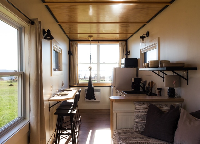 Located on a large 1.2 acre waterfront lot, The 380 sq ft tiny home consists of one bedroom and stairs to a loft, both with queen size beds, there is a second loft for storage or play area for children. The tiny home is ideal for four adults or two adults and two children. Our tiny home is rated for -40 degrees Celsius and we have a Standby Generac Generator that turns on automatically, so you will never be out of heat or WIFI; and there is snow removal