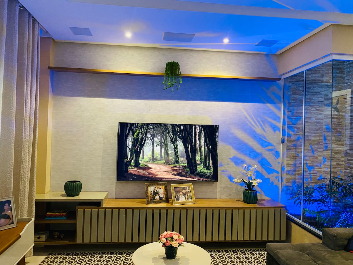 Casa ampla, 1 quarto com cama queen, mesa pra trabalho, guarda-roupa amplo, ar condicionado, TV 42’. 1 suíte, cama queen + closet, ar condicionado, TV 42’ 1 quarto com 2 camas de solteiro, baú para roupas, ar condicionado 1 banheiro social + lavabo Churrasqueira Gira Grill Área de Lazer com Piscina Casa localizada no centro da cidade, 5 minutos a pé de farmácia, padaria, mercado e principal praça da cidade. 🚫 Proibido das festas na casa 🚫