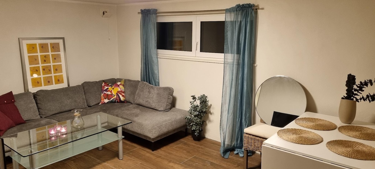 Romslig og fredelig overnattingssted med sentral beliggenhet. Boligen har tre soverom og to stuer - en stue med peisovn og direkte utgang til terrasse og en tv-stue som også har piano. Kjøkkenet er fullt utstyrt for matlaging, og det er kaffe og kaffetrakter til fri bruk. Senger vil være ferdig oppredd når gjestene kommer, og det er håndklær på badet. Det er ett bad og i tillegg et separat toalett. Vaskemaskin og tørketrommel er plassert i kjelleren og kan brukes etter egen avtale.