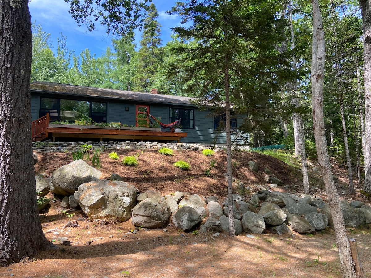 Romantic and luxurious, this 2,000 square foot modern cottage nestled on twelve acres is a favorite of honeymooners and lovers of modern design * One hour to Acadia National Park & Bar Harbor; 15 minutes to shopping, hiking, swimming * Stargazing deck * 2 full baths, one with steam shower * Fully equipped kitchen with under-counter fridge/freezer * Two gas fireplaces, one indoors, one on a covered deck * Queen bed with luxurious linens and pillows * WIFI, streaming TV, grill, bar * EV charger