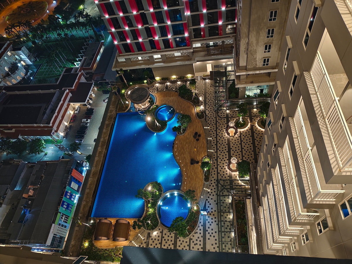 Rilassati in questo appartamento tranquillo ed elegante, dotato di piscina a sfioro e palestra gratuita, situato in cima al Pakuwon City Mall, con tanta varietà di cibo a pochi passi. Ideale anche per il tuo soggiorno con Netflix gratuito! Ottima posizione a soli 30 minuti dall'aeroporto e a 15 minuti dal centro città. Scuole e attrazioni nelle vicinanze Parco di Shanghai Via dello shopping di San Diego La via dello shopping di San Antonio Galaxy Mall Università: Unair, ITS, Widya Mandala, Widya Kartika