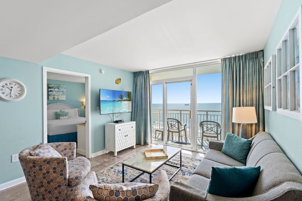 Ocean View | Community Pools & Hot Tub | Free WiFi Experience the ultimate Myrtle Beach getaway from this inviting oceanfront condo! Just steps from the beach, world-class shopping, golf courses, and family-friendly attractions, this vacation rental puts everything at your fingertips. With direct access to the Myrtle Beach Boardwalk and Promenade, exploring the area has never been easier.Starbucks on site. The condo comfortably sleeps guests with 2 Queen Beds and a sleeper sofa in the living r