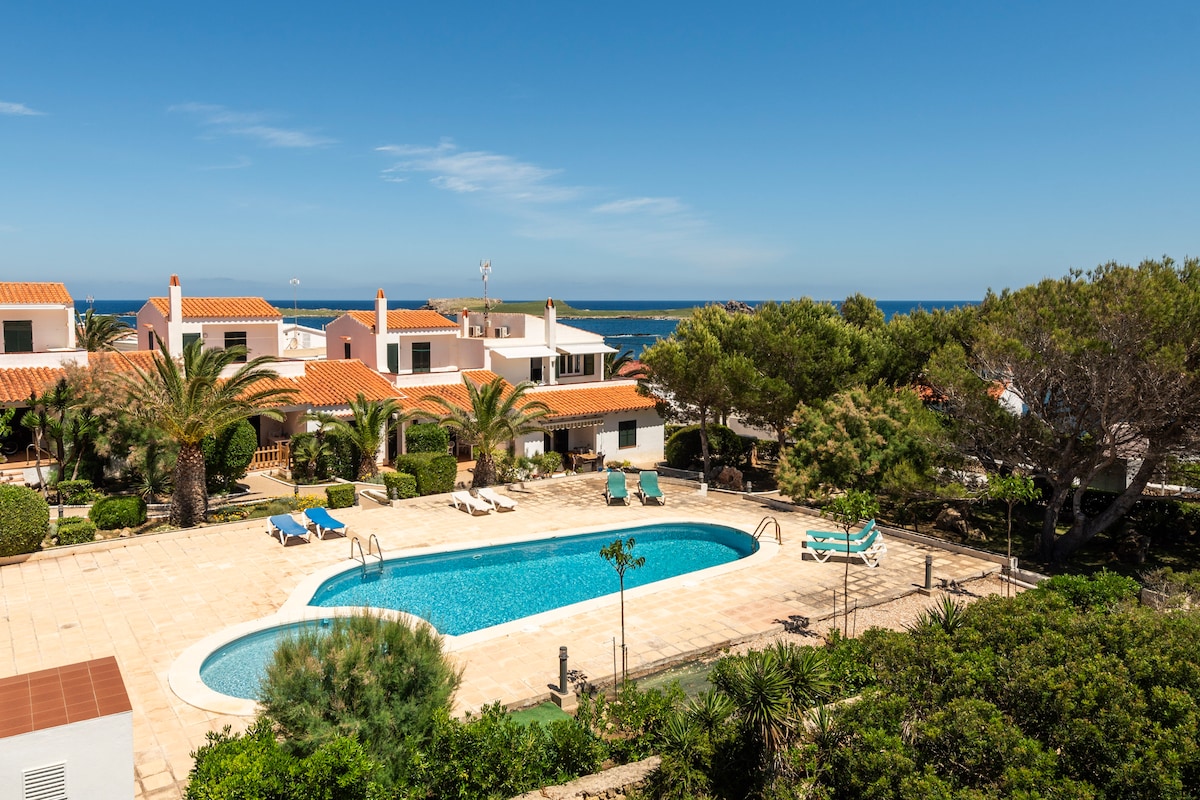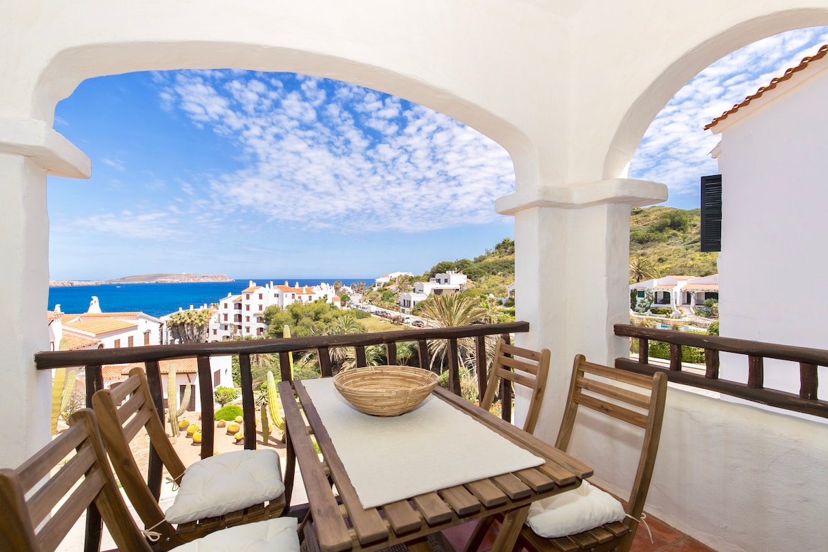 Appartamento ideale per 6 persone con vista sull'oceano e accesso diretto alla spiaggia d'Arenal d'en Castell. 3 camere da letto 2 bagni , zona comune del soggiorno e cucina completamente attrezzata Potrete godere di un soggiorno accogliente, in un appartamento ristrutturato, con tutti i tipi di comfort a portata di mano. La zona idromassaggio e le sue terrazze offrono la possibilità di godere appieno degli esterni della casa.