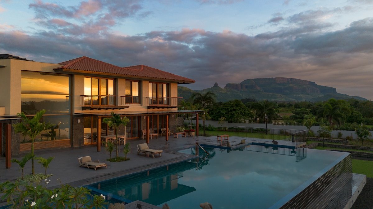 🏡 Villa con 4 camere da letto e cucina, sulle colline di Anjaneri, a 25 min da Nashik e 2,5 ore da Mumbai - Può ospitare da 8 a 16+ persone, dispone di una piscina privata e 4,5 bagni - Ampie zone giorno e relax con un accogliente mini bar - Cucina completamente attrezzata ed elegante sala da pranzo interna - Chef in loco disponibile (a pagamento) per deliziosi pasti o barbecue - Struttura che accetta animali domestici🐕🐶 Perfetto per vacanze in famiglia, occasioni speciali o ritiri tranquilli vicino ai vigneti di Sula🍷e al tempio di Trimbakeshwar.🛕