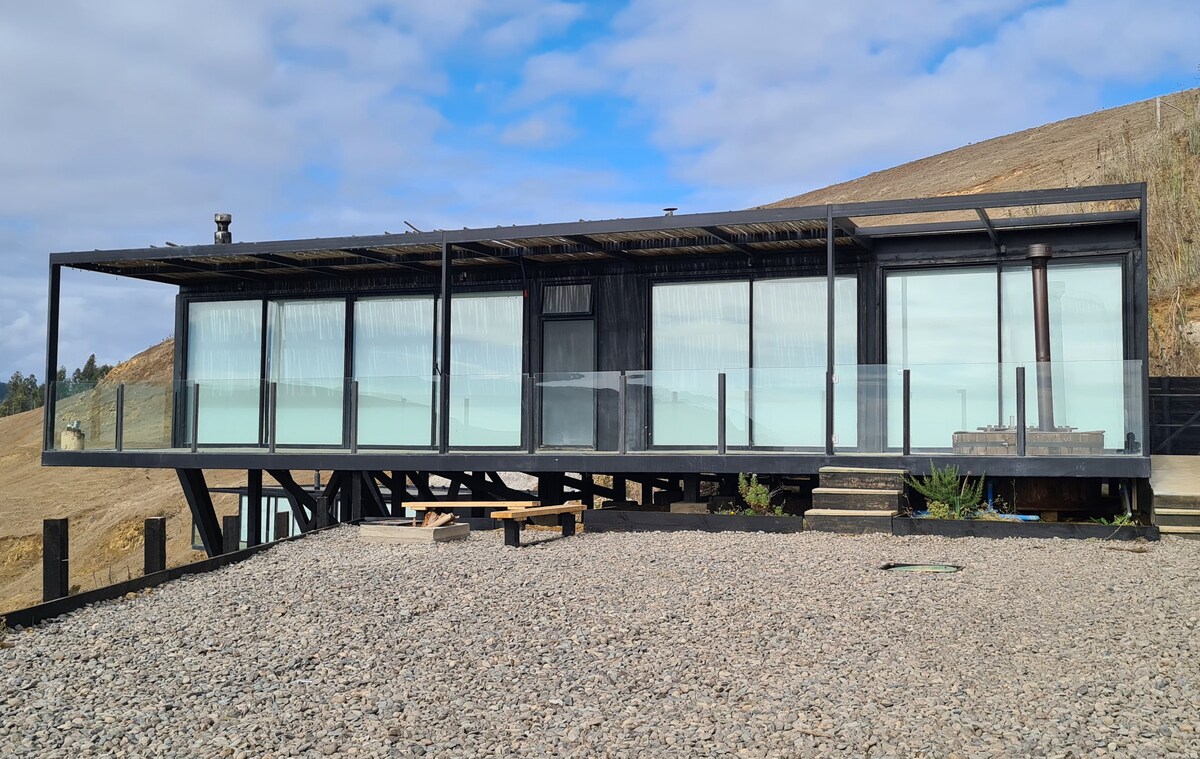 Cabaña para 2 personas rodeada de bosques, ideal para una escapada en busca de tranquilidad y desconexión en la naturaleza, con noches mágicas bajo las estrellas. Cuenta con Hot Tub privado disponible 24 horas en la terraza, Wifi, Smart TV, sábanas y toallas, parrilla a gas, Bosca, leña, cocina completamente equipada (vajilla completa, refrigerador, microondas, horno eléctrico, hervidor, tostador, cafetera francesa), parlante bluetooth y estacionamiento privado. A 15 minutos de Puertecillo.