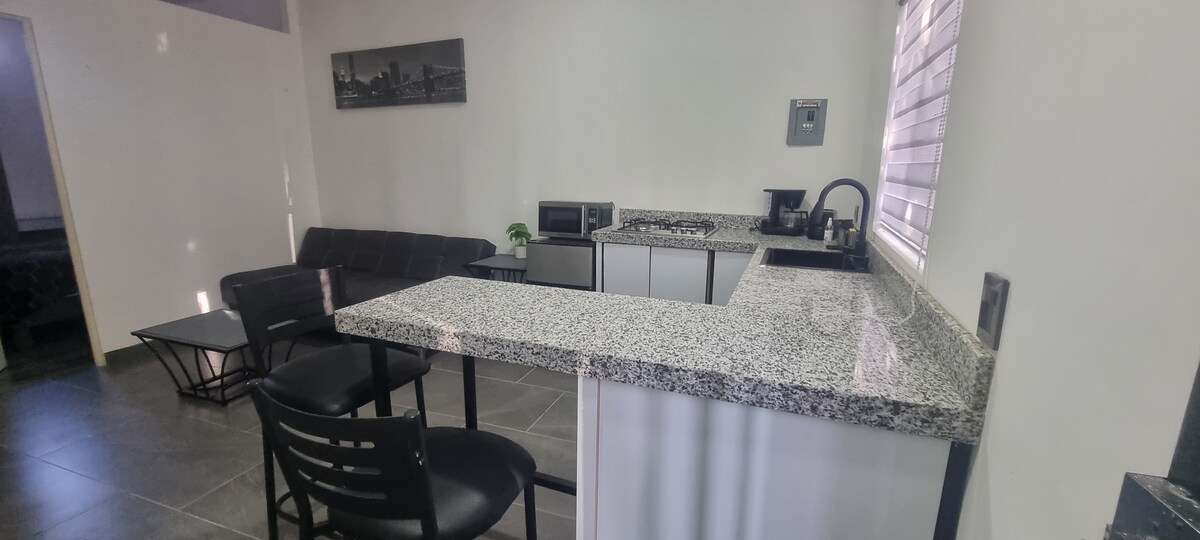 Appartamento tipo loft bellissimo e super confortevole con ingresso indipendente. È progettato per due persone, ma potrebbe entrarci una terza perché c'è un divano letto. Recentemente ristrutturato con mobili nuovi! Ottima posizione, a 1,2 km dall'IMSS 16 e da strutture specializzate, a 3 minuti da BLVD ad alto afflusso, centri commerciali, ristoranti, ecc. Avrai tutti i comfort WIFI, aria condizionata, TV via cavo, acqua con forte pressione e goderti la notte su una bella terrazza.