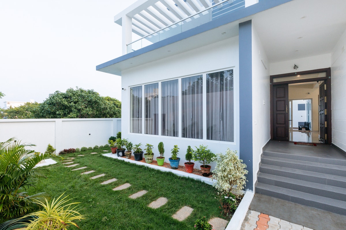 Moderna casa sulla spiaggia con 4 camere da letto: Lumina Villa offre una vacanza perfetta a Chennai. Goditi la grande e scintillante piscina privata di giorno o di notte e raggiungi facilmente a piedi la spiaggia. Goditi uno spazioso comfort in tutto, ideale per gruppi piccoli e grandi (24 posti letto) e divertimento in famiglia, con vista sull'oceano da alcune camere! Include cucina completamente attrezzata, WiFi, alimentazione di riserva, parcheggio e supporto per i custodi utili. Consegna a domicilio/ristoranti alimentari nelle vicinanze. La tua base ideale per soggiorni memorabili, divertimento di gruppo e piccoli eventi su ECR.