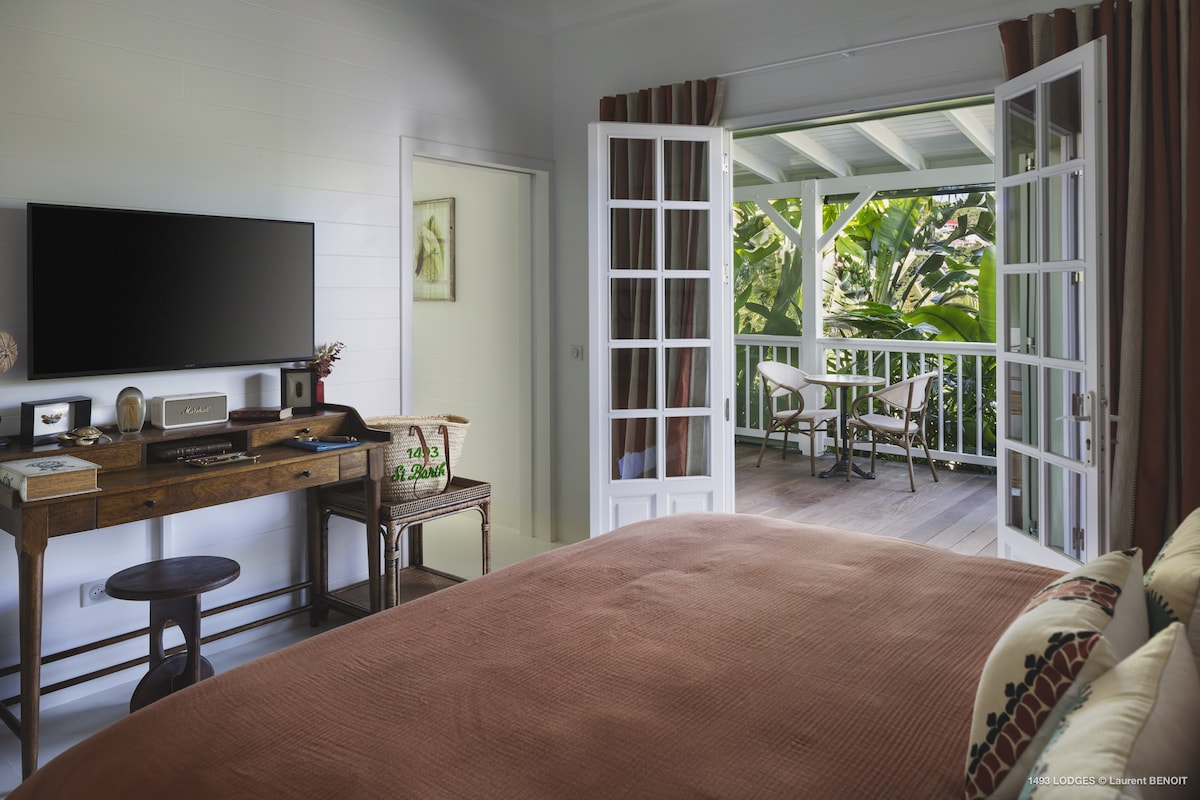 St. Barth, perle de la Caraïbe. Nous sommes heureux de pouvoir vous accueillir dans un lieu calme, eco-responsable et sain. Notre but est de relier simplicité et luxe avec une touche de modernité comme la fibre optique WIFI par exemple. Tout en respectant l'environnement, l'histoire de notre île et le bienêtre holistique des occupants. Bungalow indépendant avec une surface habitable de 55 m2 plus 15 m2 de terrasse, situé dans un jardin tropical luxuriant, sur un terrain de 3400 m2.