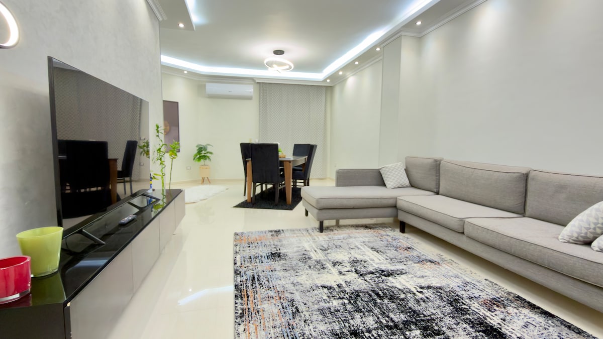 Relax and enjoy your stay in this cozy two-bedroom apartment in New Cairo, just minutes from the American University in Cairo. The apartment features a private garden, perfect for relaxing or enjoying your morning coffee. All amenities are located inside the compound, including cafés, restaurants, and shopping areas. Fully furnished with Wi-Fi, two smart TVs, air conditioning in all rooms and the living area, self check-in, and free parking. Ideal for families, couples, and business travelers.