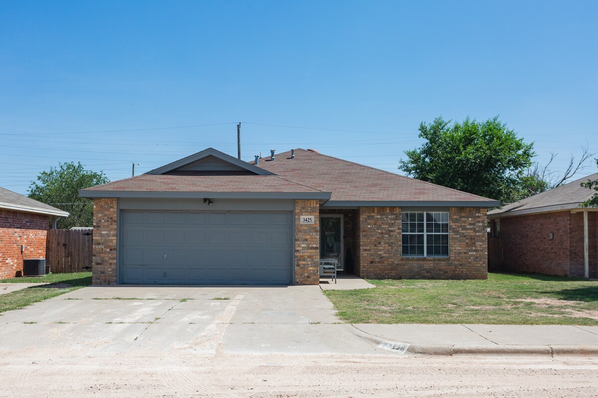 Vieni a rilassarti in questa casa con 3 camere da letto e 2 bagni, con letti king size in ogni stanza. Hai anche accesso al garage. Internet gratuito e caffè ti aspettano in un quartiere per famiglie. Situata a 10 minuti dal Texas Tech, dall'UMC e a breve distanza in auto dalle zone più famose di Lubbock. È il luogo perfetto per rilassarsi con amici, familiari e animali domestici.