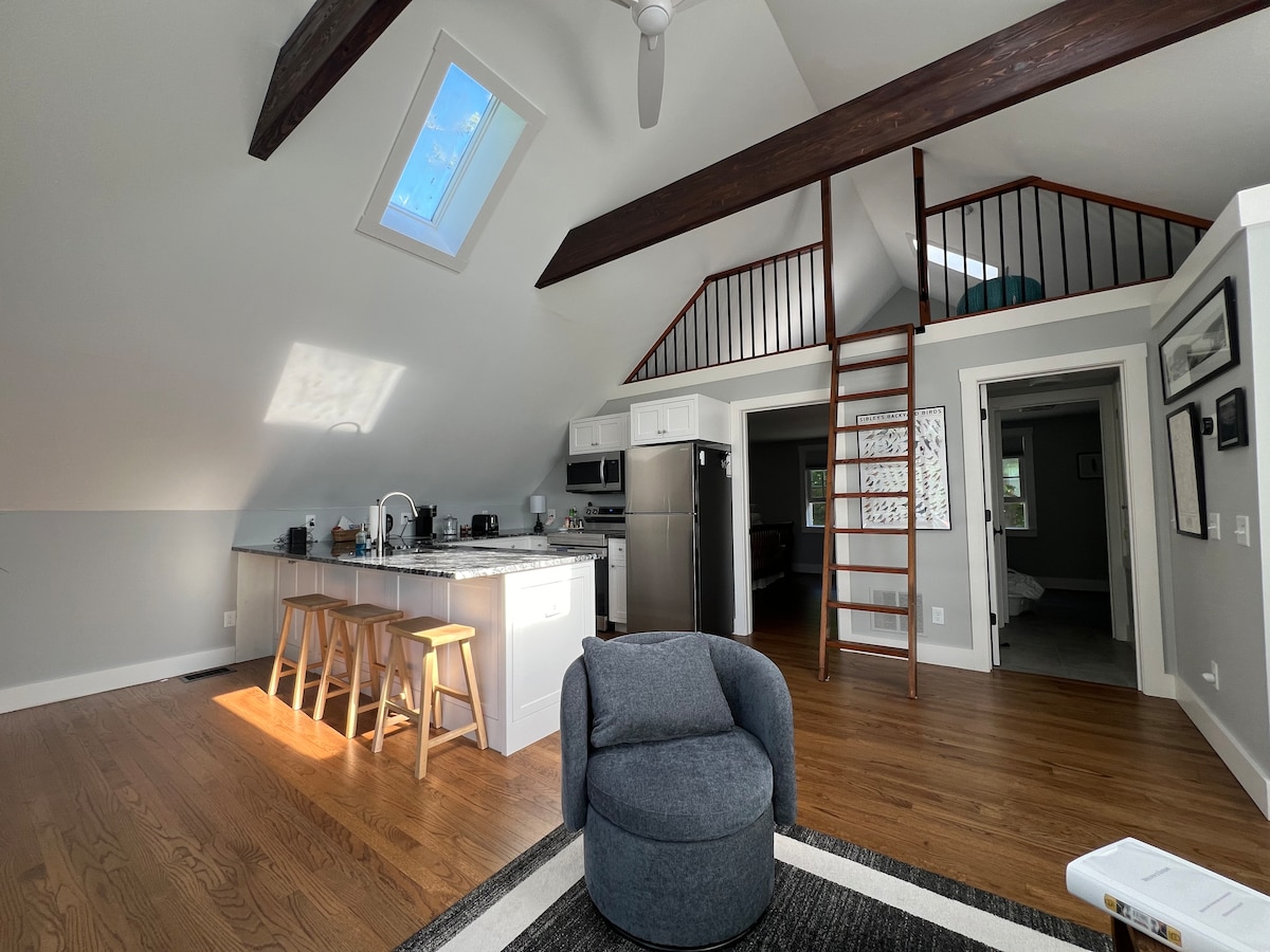 Nel cuore di Sunapee Harbor si trova "Topside", un'affascinante suite per gli ospiti che vogliono immergersi nella vita attiva di Sunapee. Topside è perfetta per 2 persone e accogliente per 4. L'uso efficiente dello spazio offre un letto matrimoniale, un divano letto estraibile, un materasso gonfiabile singolo, un angolo cottura fornito di alimenti per la colazione, snack e utensili di base per cucinare, un bagno privato, il wifi, una smart TV, giochi da tavolo e una terrazza sull'albero. Molto pulito, elegante e confortevole!