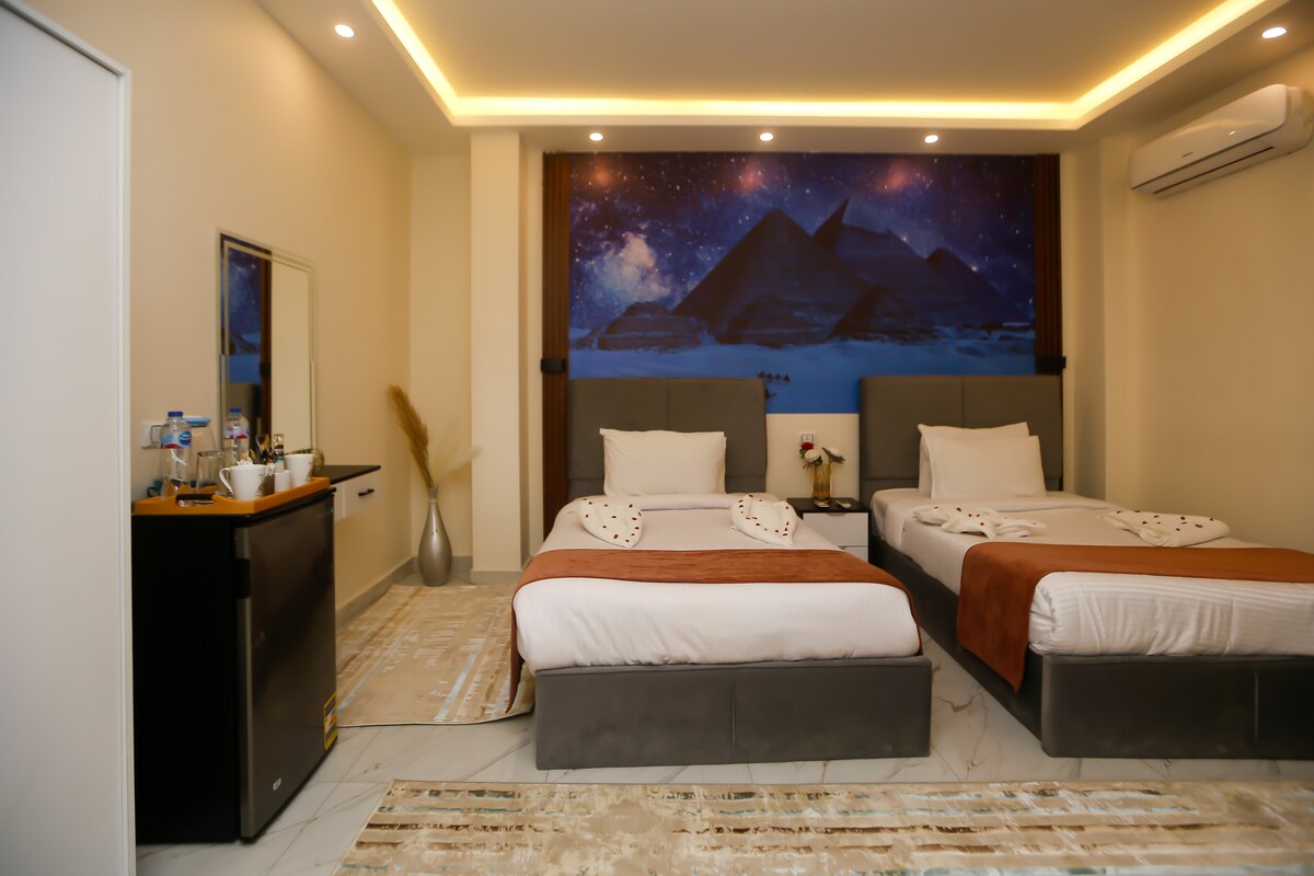 Svegliati a pochi minuti dalle Piramidi in questo soggiorno confortevole e ben posizionato. Gli ospiti amano le camere pulite e spaziose,l'atmosfera amichevole e accogliente, la vista mozzafiato sul tetto delle piramidi illuminate di notte. L'ospitalità a conduzione familiare garantisce un'esperienza calda e casalinga, e la deliziosa colazione locale è un ulteriore vantaggio. Che tu stia esplorando le attrazioni o cercando un rifugio tranquillo, questo posto offre una combinazione perfetta di comfort, comodità e autentico fascino egiziano.