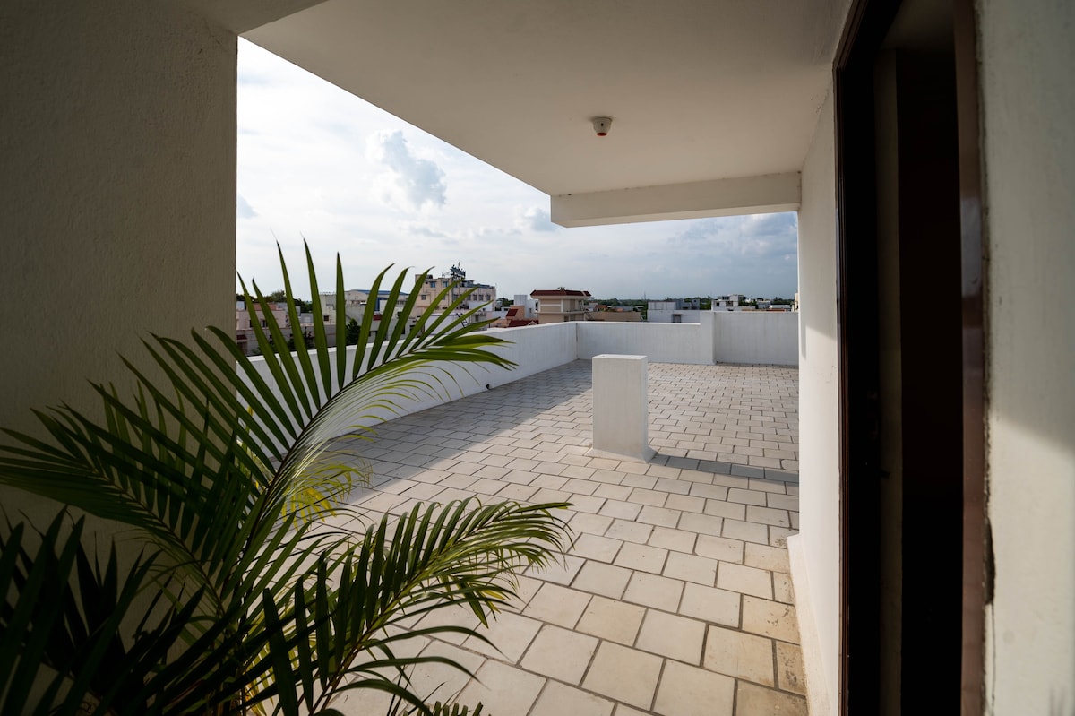Soggiorna nel nostro accogliente monolocale sul tetto nel cuore di Srirangam, a pochi passi dal Tempio Sri Ranganathaswamy. Perfetto per viaggiatori spirituali e turisti, offre un'atmosfera tranquilla, un letto comodo, un angolo cottura e il WiFi ad alta velocità. Raggiungi facilmente il tempio di Jambukeshwarar, Rockfort e la diga di Kallanai. Vicino a ristoranti e trasporti locali. Goditi un soggiorno tranquillo e ben ventilato con tutti i servizi essenziali. Si prega di notare che durante il soggiorno accogliamo solo coppie sposate o famiglie.