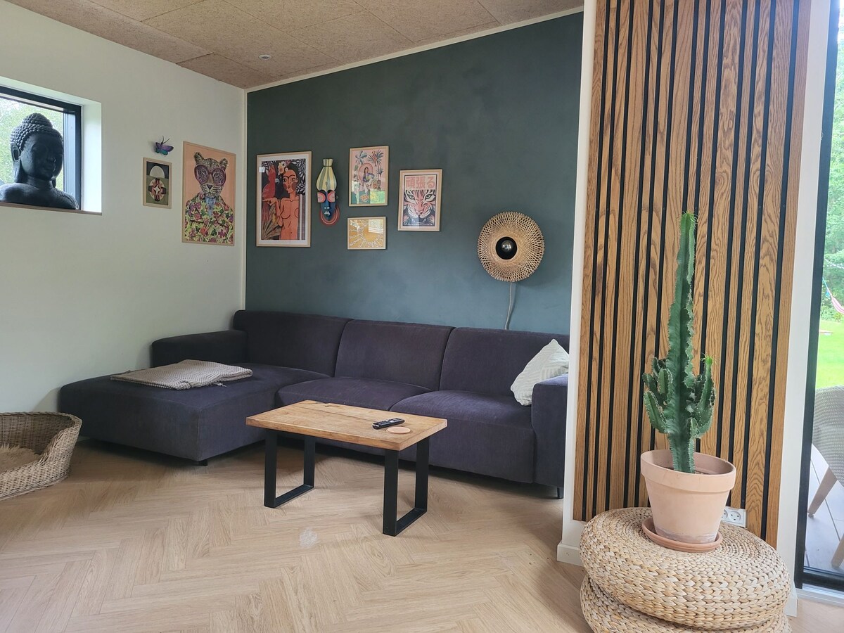 Vicino alla città c'è una casa in legno nascosta nel bel mezzo di una foresta. Sembra fantastico. Qui si respira la natura, la tranquillità e la foresta, ovunque si guardi. La casa è ben attrezzata, le camere accoglienti e la terrazza perfetta per il caffè mattutino, il pranzo all'aria aperta, il barbecue o sdraiarsi su un lettino e leggere un libro. Cammina nella radura e accendi un fuoco o salta sul trampolino con i bambini. Nella casa troverete la cucina, i servizi igienici e il bagno e un accogliente salotto con stufa a legna. Gioca a giochi da tavolo o riproduci in streaming un film. Rilassati qui.
