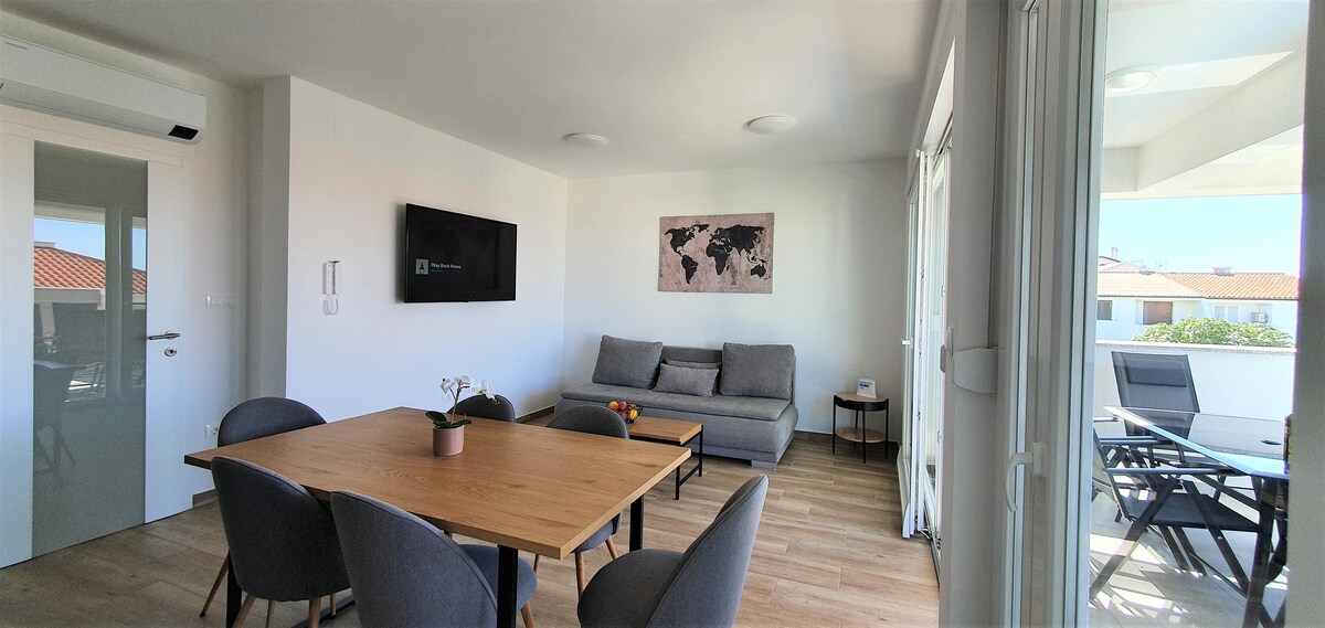 Moderna villa di lusso con piscina e vista mare. La villa dispone di 5 moderni appartamenti arredati per 6 persone con ampia terrazza e splendida vista sul mare. Appartamento dotato di wi fi gratuito, aria condizionata e posto auto. Nel giardino c'è una bella piscina (condivisa con gli altri ospiti ) dove gli ospiti possono rilassarsi tranquillamente durante il giorno. Villa si trova a pochi minuti a piedi dalla spiaggia e non lontano dal centro della città. Vicino alla villa ci sono negozi di alimentari e una fermata dell'autobus con linee dirette per la spiaggia di Zrce.