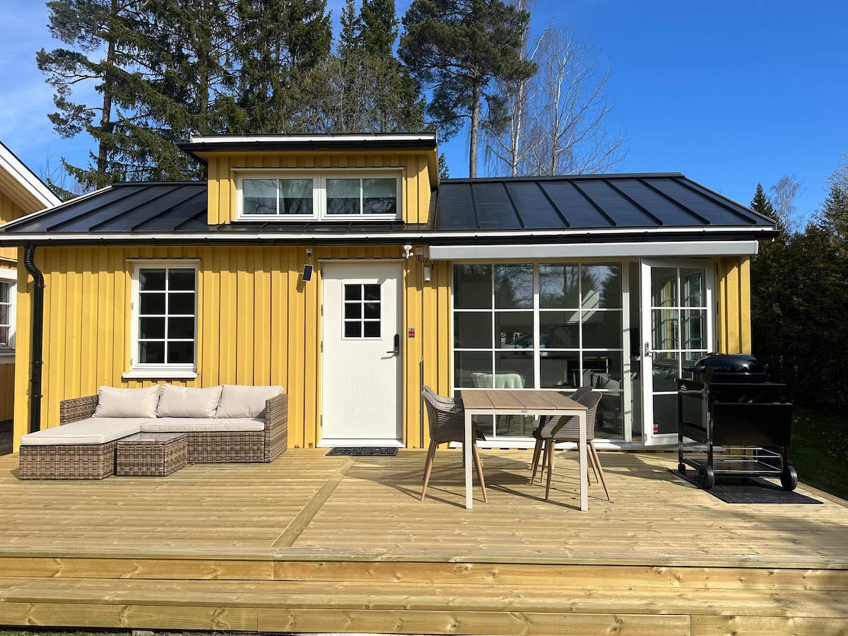 Charming 130-year-old cottage (90 m²) with a modern yet cosy feel. Two renowned spas (Yasuragi & Skepparholmen) within walking distance. Bottom floor: kitchen and dining area with classic wood stove, living room and bathroom. Your own garden and spacious wooden deck—perfect for sunbathing or BBQs. Set in a beautiful area with a crystal-clear lake for bathing just 200 m away, with a nature reserve surrounding it. Sea dock ~700 m. 30 minutes to Stockholm by Waxholm boat, bus or car.