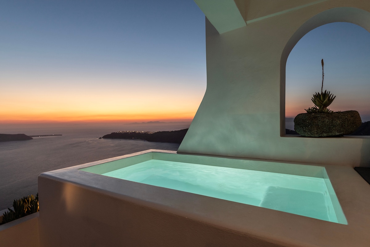 Villa sole in marmo con vasca idromassaggio e vista sulla caldera