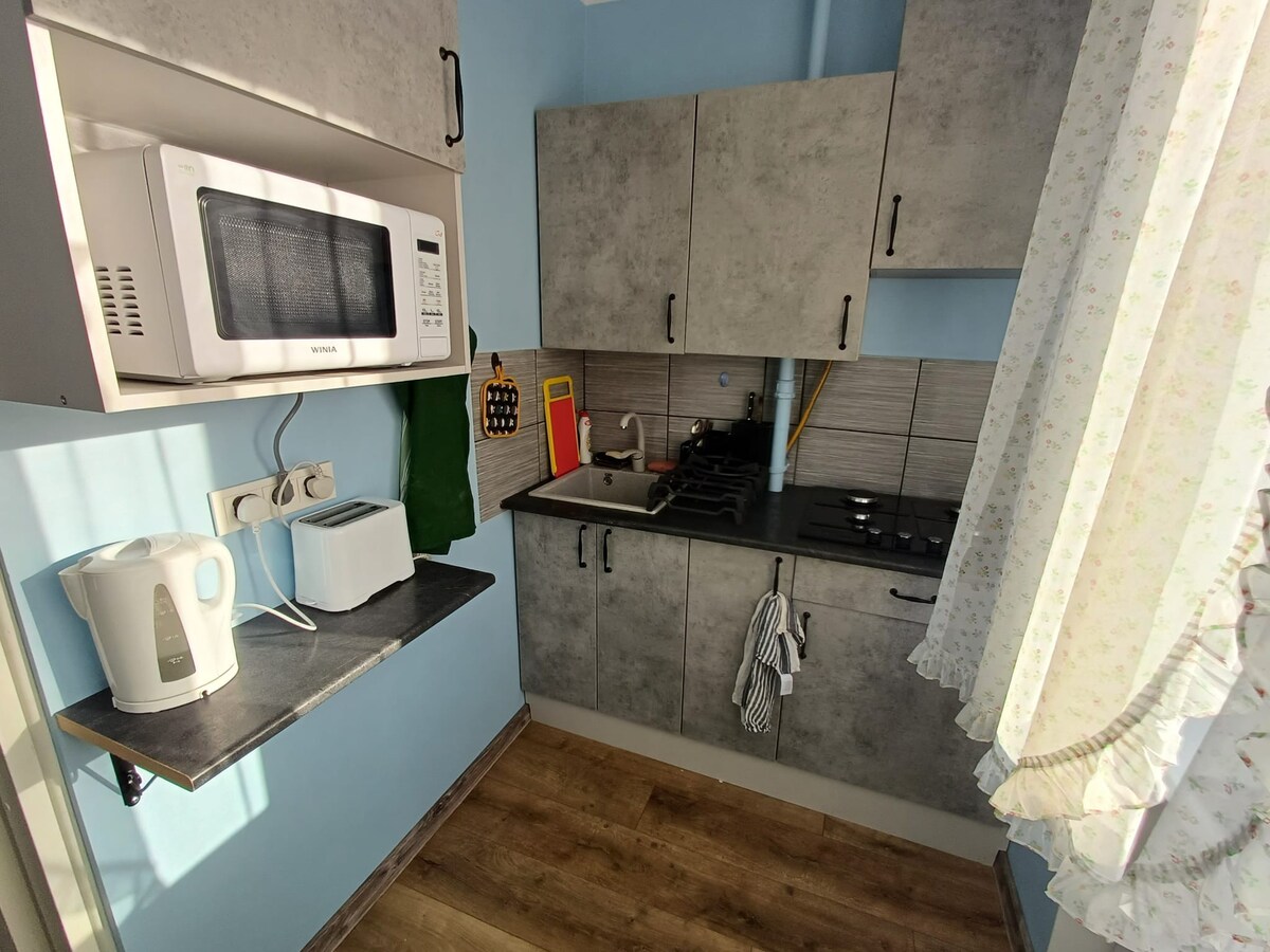 Rilassati con tutta la famiglia in questo alloggio tranquillo. Ampio letto comodo in camera da letto con TV a parete , comodo divano letto in soggiorno,anche tavolo con sedia per lavorare con la scrivania . entrambe le stanze enormi armadi per i vestiti. Bagno con servizi igienici. WiFi con connessione Internet 5 g. Cucina davvero buona con fornello a gas,forno a microonde,bollitore,tostapane. Salotto anche con tv.