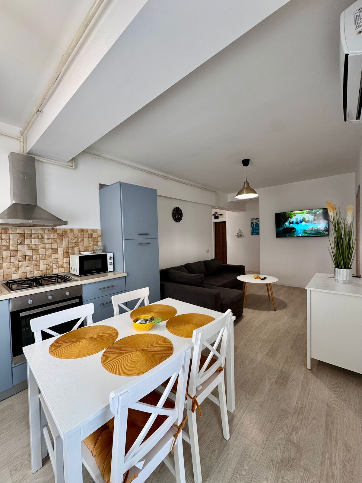 Questo accogliente monolocale si trova in un nuovo edificio moderno con parcheggio; a pochi passi dal famoso relitto e dalla location del festival Beach Please, ideale per gli amanti del mare, del sole e del divertimento. Il monolocale ha una superficie di 46 mq, una capacità massima di 4 persone, è perfetto per una coppia, una famiglia o un gruppo di amici. Dispone di due letti king size, bagno, cucina open space e sala da pranzo. Prenota subito il tuo soggiorno e vivi l'atmosfera di Costinesti.