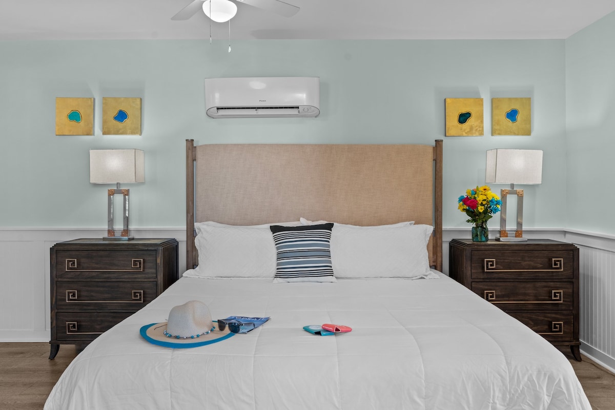 Cottage with two private King bedrooms with en-suite bathrooms. Enjoy views of the ocean from the private balcony. A fully-equipped kitchen and dining table. Second floor cottage (accessible by stairs only). Pets not permitted. Guests have access to an on-site pool, outdoor showers, and guest laundry. Hotel is walking distance from beach access and restaurants. Loggerhead Inn & Suites is a Boutique Hotel in Surf City, NC and is managed by North State Hospitality.