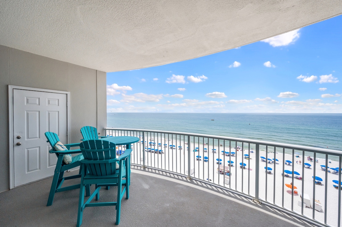 Indoor and outdoor pools!! Gulf Front! - 1700 sq ft beds for 10 guests. On 14th floor with an addictive view of the emerald green Gulf of Mexico, balcony, 2 bedrooms with king beds and ensuite baths, 2 queen sleeper sofas and 2 twin rollaway beds. The kitchen is fully equipped. Table/bar seating for meals. Washer/dryer in unit. Gym, hot tub, kids splash pad. We offer starter sets for paper products, and detergents. WiFi provided. Stays over 1 week may require additional cleaning fees.
