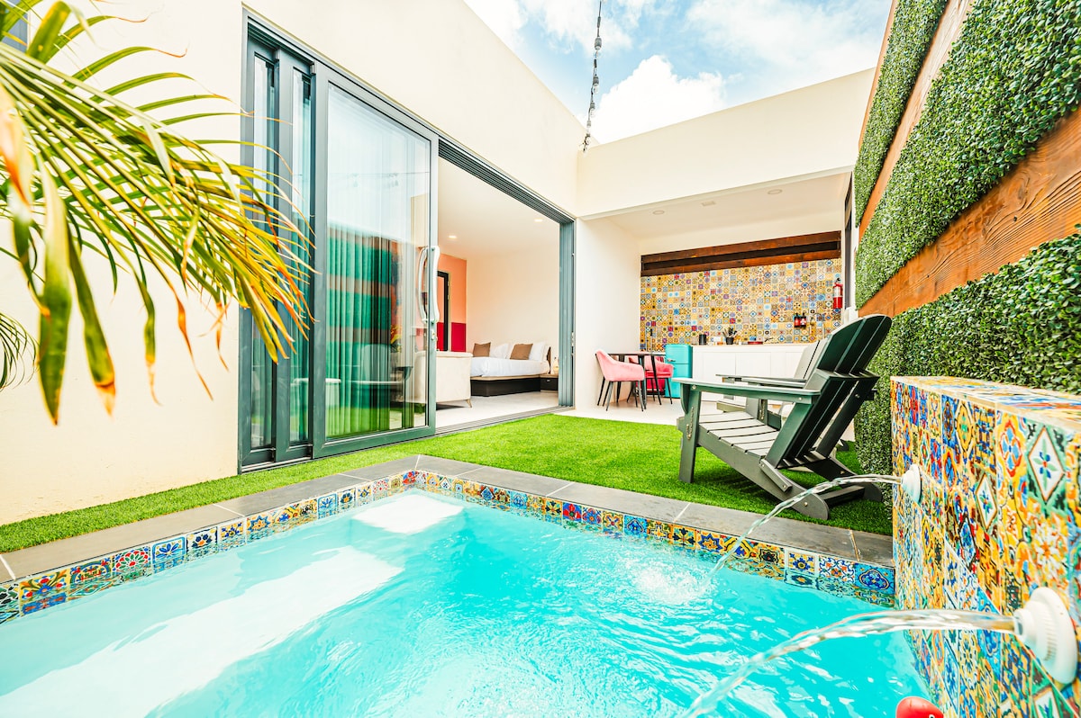 Your own private studio in an adults-only boutique retreat, designed for comfort and seclusion. Each space features a private plunge pool, lush garden, fully equipped kitchen, king-size bed with premium linens, sleek bathroom with hot shower, and a spacious living area with a 65" HD TV. A curated Aruba guide and attentive guest services complete your stay. Welcoming 3 guests per studio.