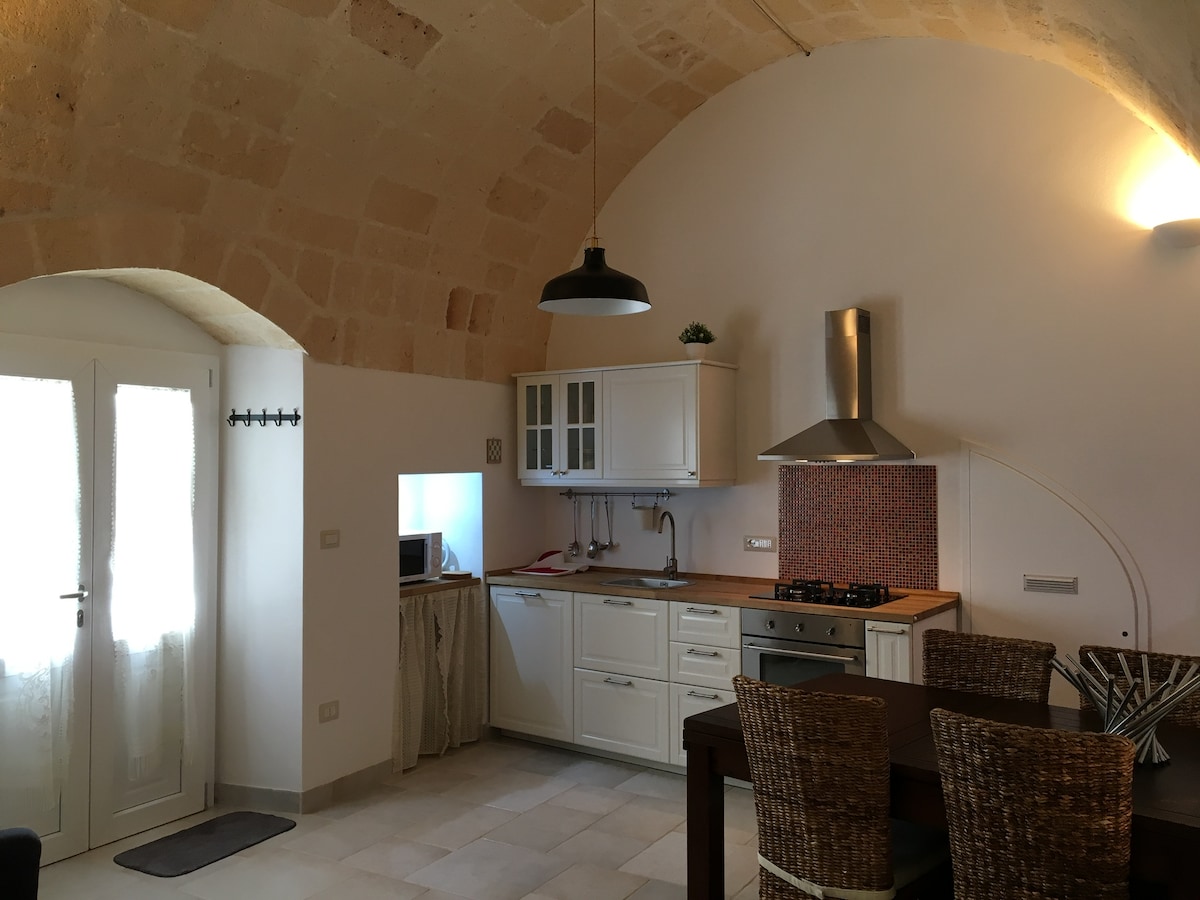 CIS: BR07401291000000188 CIN: IT074012B400033730 Vivi la magica sensazione di trovarti tra passato e presente: è una dimora storica! I pavimenti d'epoca e le pareti in pietra fanno da sfondo a un ambiente arredato con oggetti di design, vecchie ceramiche e mobili locali. L'ampio terrazzo privato, con solarium e doccia calda, saprà entusiasmarti: potrai rilassarti con un bicchiere di vino al tramonto, godere del sole su comodi lettini o preparare una cena in una magica atmosfera pugliese.