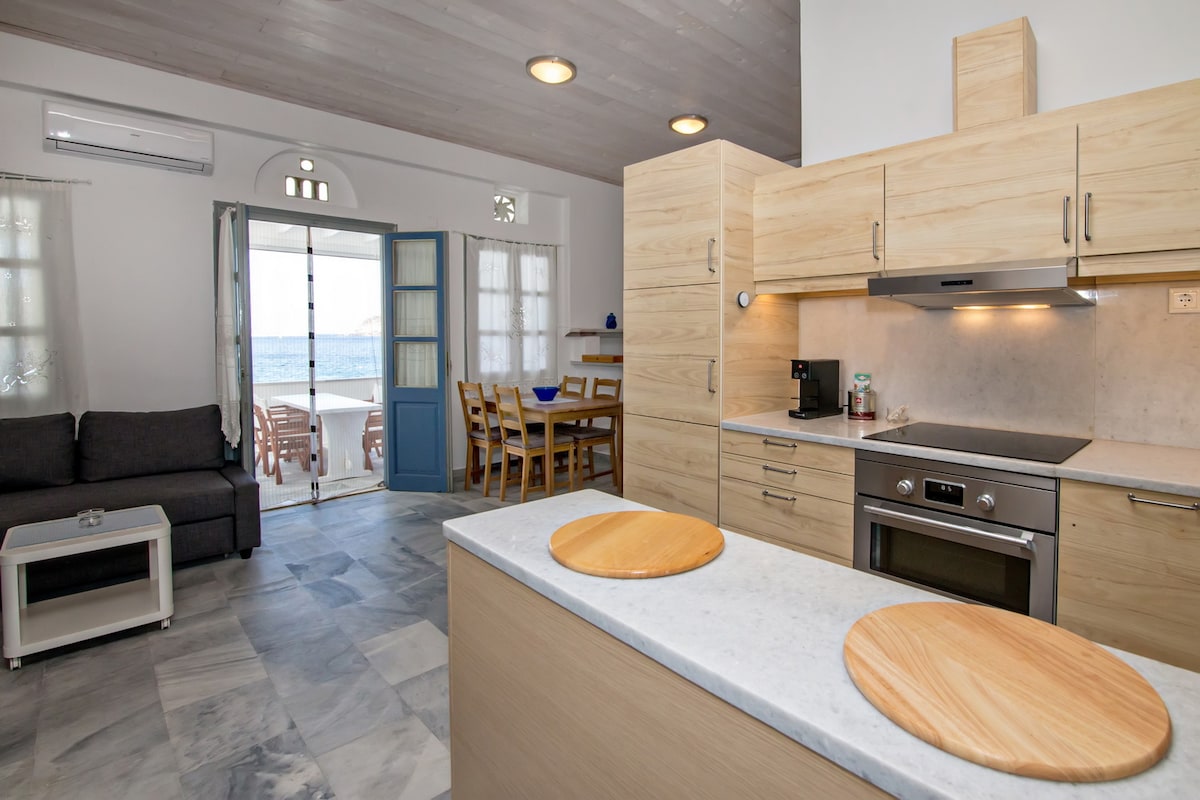 Marios, il tuo host, ti invita a goderti il relax e l'eleganza del mare arroccato sopra la tranquilla baia di Panormos, a goderti il sole mattutino con un caffè sulla terrazza o a tuffarti nel mare turchese a pochi passi dalla porta. Perfetto per famiglie e gruppi, con tutti i servizi necessari per un soggiorno senza stress. Gusta il pesce fresco locale in una taverna sul mare, visita gli artisti del marmo nella vicina Pyrgos o trascorri le giornate a fare un pisolino sulla spiaggia di fronte al tuo edificio.