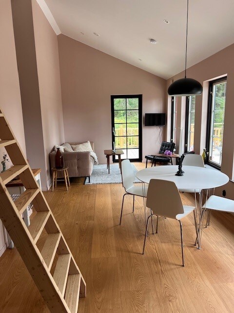 Fantastico cottage di 45 m ² con appezzamento di lago. Qui puoi nuotare dal tuo molo, uscire in barca e pescare o semplicemente goderti il tramonto dalla grande terrazza. Fibra/WiFi. TV e Apple TV. 2 camere ampie 3 loft (non a tutta altezza). Cucina attrezzata con: - Frigorifero e congelatore, lavastoviglie, piano cottura a induzione Servizi igienici con riscaldamento a pavimento Doccia e lavanderia al piano inferiore (ingresso indipendente): Doccia piastrellata con lavatrice e lavandino.