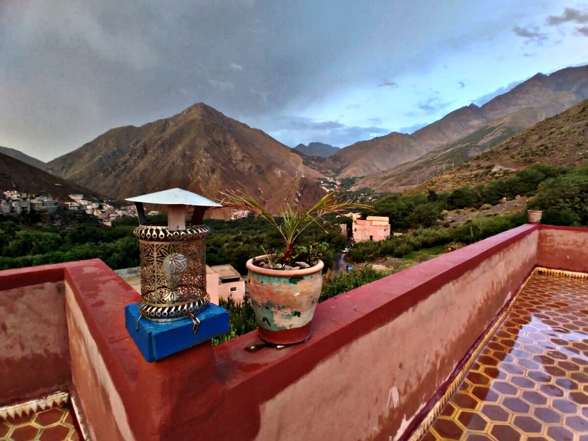 La nostra pensione è per tutti coloro che vogliono concedersi avventure o per chi è semplicemente alla ricerca della tranquillità delle montagne. Situato alle porte del Parco nazionale di Toubkal, il Riad Atlas Panorama offre una splendida vista sul villaggio e sui paesaggi circostanti. Ogni camera ha il suo balcone privato e servizi igienici con docce calde e aria condizionata che fornisce una stanza calda. Viene fornita una colazione gratuita che può essere consumata sulla terrazza o sul tetto per una vista mozzafiato.