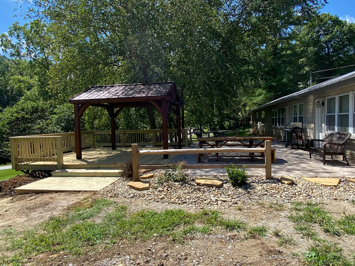 Relax in our quaint guesthouse. Have access to our beautiful farm. You will be staying on a working farm/vineyard. Walk in the woods back to the river or explore the orchard. Set up on the patio of the barn to watch the abundant wildlife or have a fire in the firepit. Food, wine tastings, and beer are available Wednesday through Sunday during winery hours. Things change here often as we are still building the winery, so come see what is new. Also visit the chickens, ducks , and turkeys.