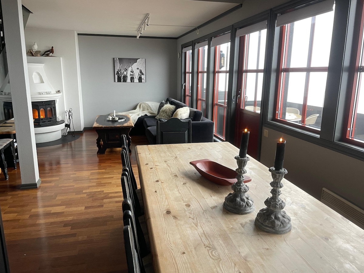 Romslig familieleilighet med peis og badstue