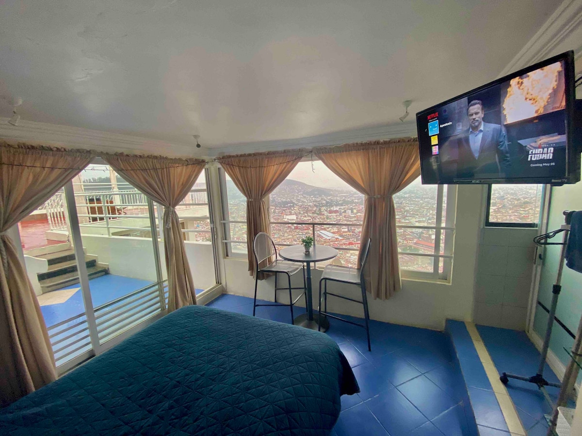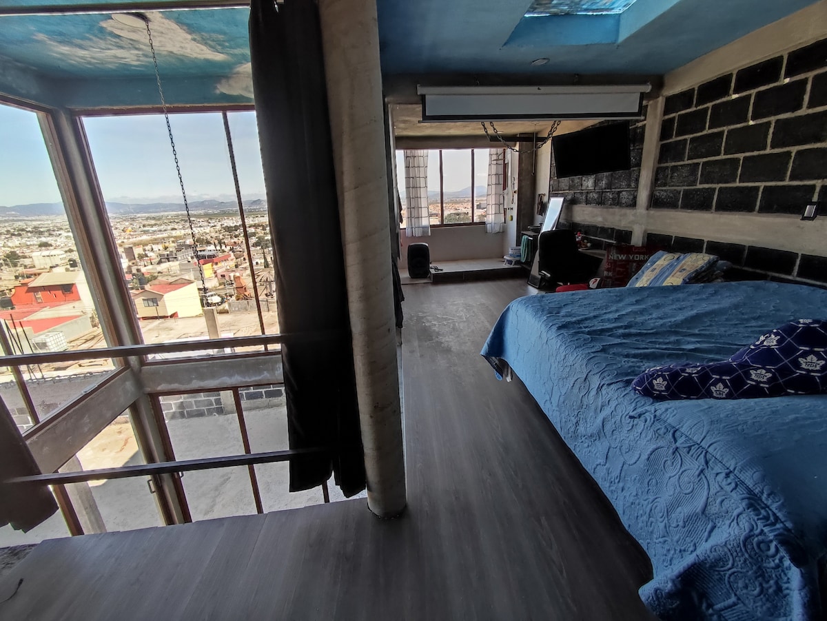 Appartamento con terrazza con vista panoramica su tutta Pachuca. Dispone di un letto matrimoniale, TV/NETFLIX, bagno completo, vasca idromassaggio, stufa, ampio bar, armadio, wifi, parcheggio privato, circuito di telecamere di sorveglianza. Con accesso a una spianata e a un belvedere. Situato a 5 minuti di auto dall'orologio monumentale di Pachuca (centro) e a 15 minuti dal magico villaggio di Real Del Monte, vicino a villaggi magici in auto, accesso ai mezzi pubblici a 3 minuti a piedi dai villaggi magici di Hidalgo