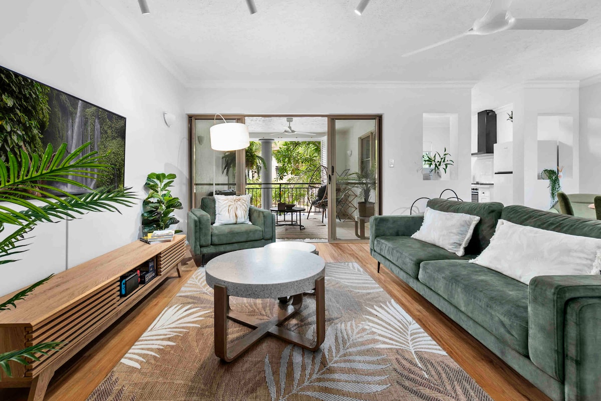 Ti diamo il benvenuto a The Green Place, un ampio appartamento con 2 camere da letto nella regione tropicale dell'estremo nord del Queensland. Ispirato alla giungla circostante, il nostro esclusivo e lussuoso appartamento ti trasporta ai tropici. *Wi-Fi e parcheggio gratuiti *Biancheria da letto flessibile *Completamente rifornito: articoli essenziali, asciugamani extra, prodotti per il bucato *Spazio per allenarsi con cyclette Situato nel Lakes Resort, con accesso a 4 piscine e vista sulle cime degli alberi dal terzo piano (solo scale). Inoltre, siamo a soli 10 minuti dal quartiere degli affari di Cairns e dall'aeroporto.