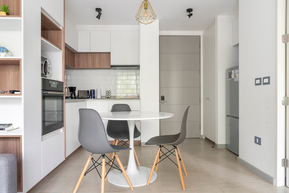 Nuovo e accogliente monolocale nella migliore posizione di Pucón, a pochi passi dalla grande spiaggia, dal centro e isolato dal rumore della strada principale. Dispone di un letto matrimoniale, un futon matrimoniale, cucina completamente attrezzata, bagno completo, WiFi, TV 49" con Netflix, Disney+ e altro, terrazza, riscaldamento, griglia, macchine da caffè, 2 biciclette ad uso illimitato, tra le altre cose. Parcheggio pubblico di fronte all'ingresso dell'edificio disponibile. Include biancheria da letto, asciugamani e forniture di base per il bagno e la cucina per ogni soggiorno.