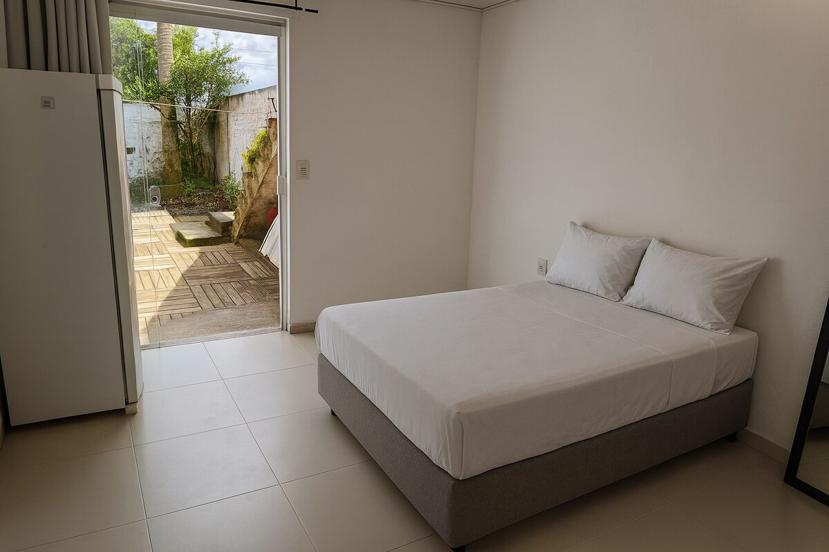 Espaço confortável localizado numa tranquila servidão na Praia da Pinheira a 700m da Praia de Baixo, 2km da Praia de Cima e 2,5km da Guarda do Embaú. O apartamento acomoda até 2 adultos e 1 criança; dispõe de uma cozinha completa com fogão, micro-ondas, geladeira. Sala com poltrona, puff e Smart TV 32 polegadas. Um quarto com cama de casal, cabideiro, ventilador e chuveiro elétrico. Além de uma aconchegante varanda com churrasqueira.