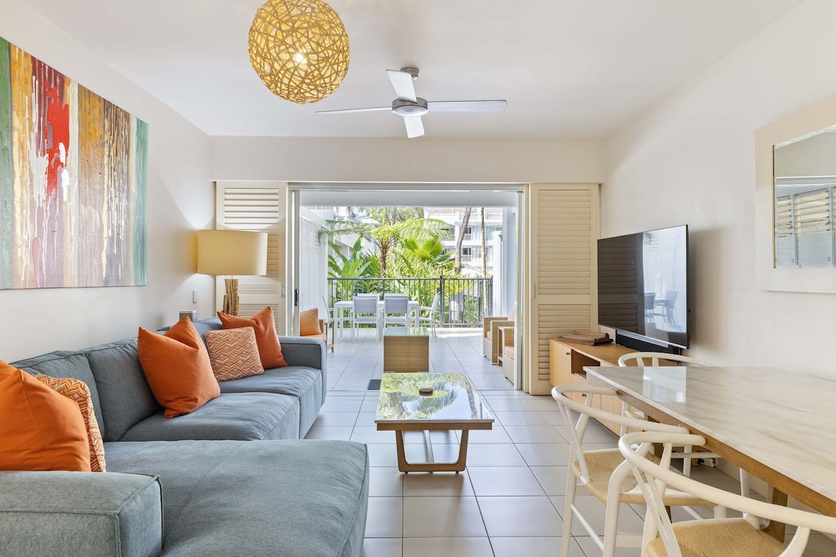 Set on Palm Cove Esplanade, where palm trees sway over white sand, this ground-floor Beach Club apartment is the perfect base for families to indulge in a tropical getaway and explore the Great Barrier Reef. Sip a crisp cider on the airy patio, unwind in the spa bath, and prepare hearty meals in the fully equipped kitchen. One of the resort’s most sought-after stays, it offers gated access to three stunning pools, along with a tennis court, day spa, and on-site restaurant just steps away.