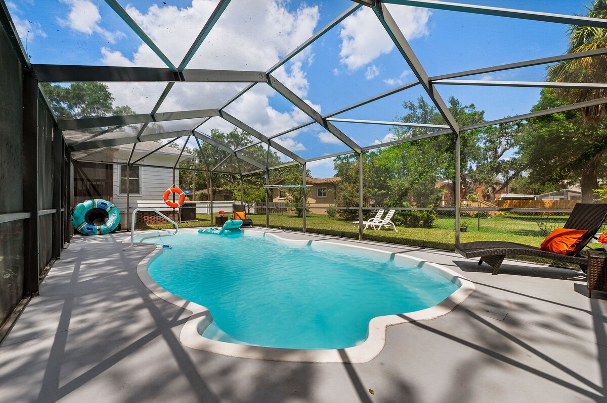 Goditi il tuo piccolo angolo di paradiso presso la splendidamente decorata Orange Oasis! 3 camere da letto e 2 bagni, oltre a un divano letto con contenitore. Piscina riscaldata. Wifi ad alta velocità e 4 TV, tutte con Hulu, Apple TV, Disney+ ed ESPN. Soffitto a volta, cabina doccia con getto a pioggia, lavatrice e asciugatrice, ampio cortile recintato, piscina, parcheggio in garage, griglia Weber e un quartiere tranquillo e sicuro. La casa è completamente attrezzata con sacchetti Ziploc, articoli essenziali per la cucina, caffè, articoli essenziali per la spiaggia e giochi all'aperto e al chiuso.