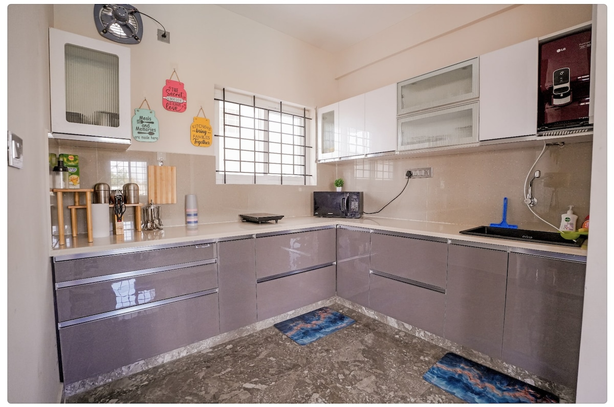 Escape to this high-tech 2BHK retreat just 1hr from Bangalore! Perfect for workcations, parties, or romantic stays. Highlights: 🏊 Private Pool: 20x12ft pool + 300sqft lawn. 🎬 Movie Nights: Projector in patio + Smart TV. 🔒 Total Privacy: Automatic gate & extended walls. 💻 Work-Ready: High-speed Wi-Fi & Air Purifier. 🍳 Full Kitchen: BBQ, Fridge, Microwave & RO water. Food delivery via Swiggy/Zomato. Pets welcome! 🐾 Quiet Hours: 10PM-6AM