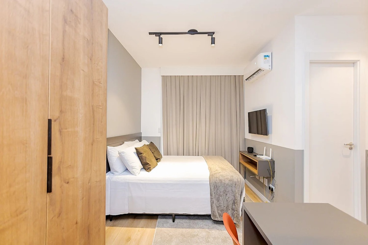 Monolocale moderno, nuovissimo, accogliente, posizione perfetta, con una bella vista dal balcone, soprattutto di notte. Wi-Fi veloce, scrivania, smart TV 55”, letto matrimoniale. Aria condizionata (caldo/freddo). Lavatrice e asciugatrice e una bella isola in cucina. 50m2 di stile-27º piano, silenzioso. Nel Centro/Batel, vicino a negozi, banche, centri commerciali, polo gastronomico e ospedale. Nell'edificio: piscina, palestra, sala giochi, sauna, vasca idromassaggio, portineria 24 ore.