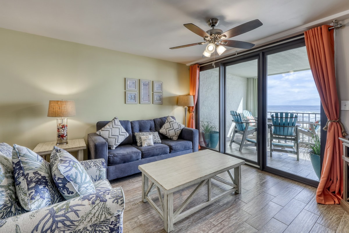 1 bedroom beachfront condo on the 7th floor that sleeps 4 with a king bed and pull out queen sofa sleeper. Enjoy a gorgeous direct view of the gulf from the private balcony. Full kitchen, washer/dryer combo, internet, cable television with smart tvs. Wake to the sound of waves, watch dolphins from the balcony and walk across the street for shopping and dining . Relax at our beachfront pool with a private boardwalk to the sand. Clean, comfortable, and steps to the Gulf—your perfect getaway!
