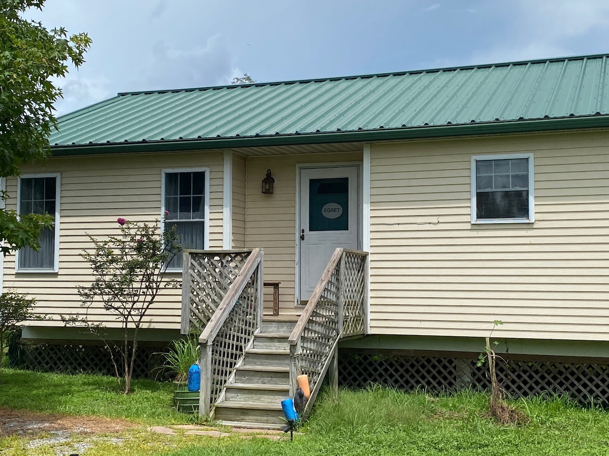 Questo splendido e pittoresco cottage si trova a Muddy Creek, dove si incontrano il fiume Perquimans e l'Albemarle Sound. Offre una vista impareggiabile sui magnifici cieli al tramonto e all'alba sull'acqua, mentre sei circondato da una varietà di fauna selvatica. All'interno, il cottage ha un concetto aperto con una grande stanza e un bagno completo separato. Le vetrate offrono viste panoramiche sull'acqua che ti accolgono non appena varchi la soglia di casa. Un rifugio ideale per coppie o famiglie con bambini piccoli.