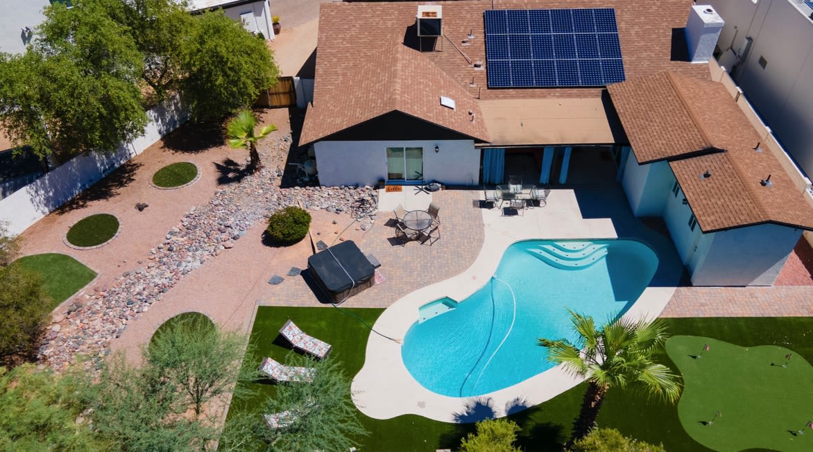 Discover your stylish oasis in South Scottsdale, moments from Old Town. This 4-bedroom w/ 7 beds retreat features all new furniture, TVs in every room, pool table, arcade game, and memory foam mattresses. The fully remodeled house offers a dazzling sunset mural as you walk out to the spacious backyard for games, BBQ, hammock, outdoor dining table, plenty of seating and a beautiful diving pool with electric heater (inquire for more info). Have the ultimate time at this relaxing retreat!