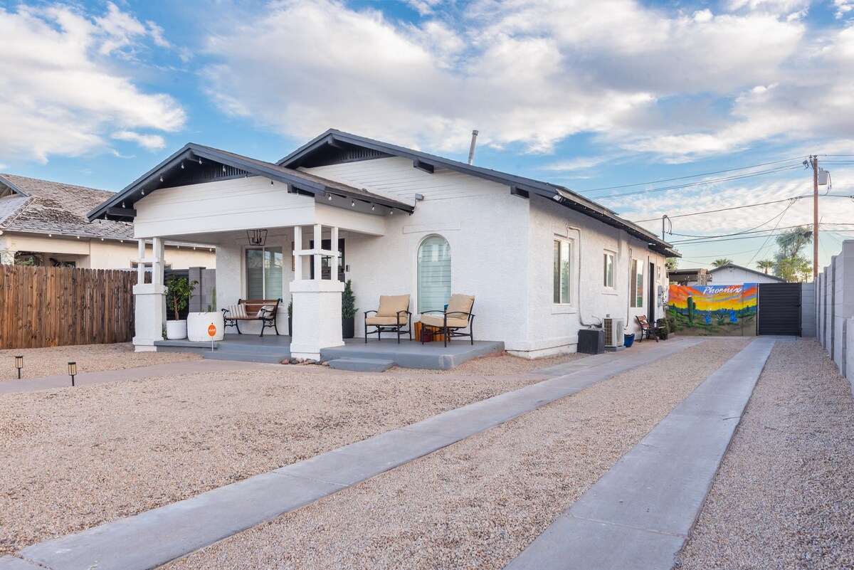 Reliably operated by a top AZ Superhost with 4,400+ 5 star reviews. Stay in style in Coronado Historic District! Our unique and private 1bdrm getaway is the perfect choice for couples or solo travelers (also dog friendly). Unwind in a clean, bright unit tucked away on the back of a WPA era triplex. Fenced and gated yard with a large shade tree, outdoor seating, BBQ, shade sails, bistro lights in the evenings, and view of sunsets in the west sky. Private parking in front of your gate. INCLUDED 👇